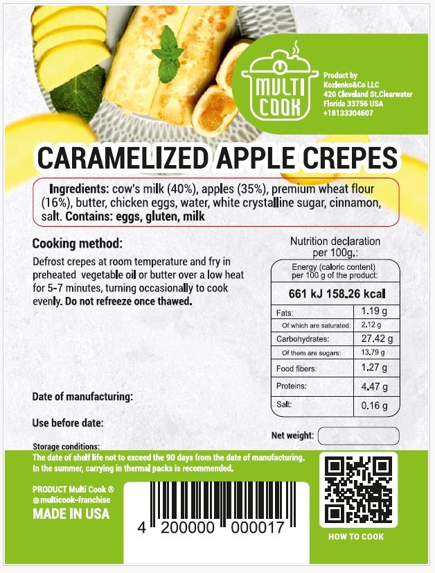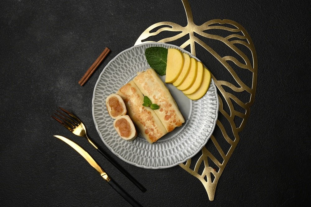 A classic sweet crepe filled with tender stewed apples and aromatic cinnamon. Delicious for breakfast, dessert, or a comforting snack.