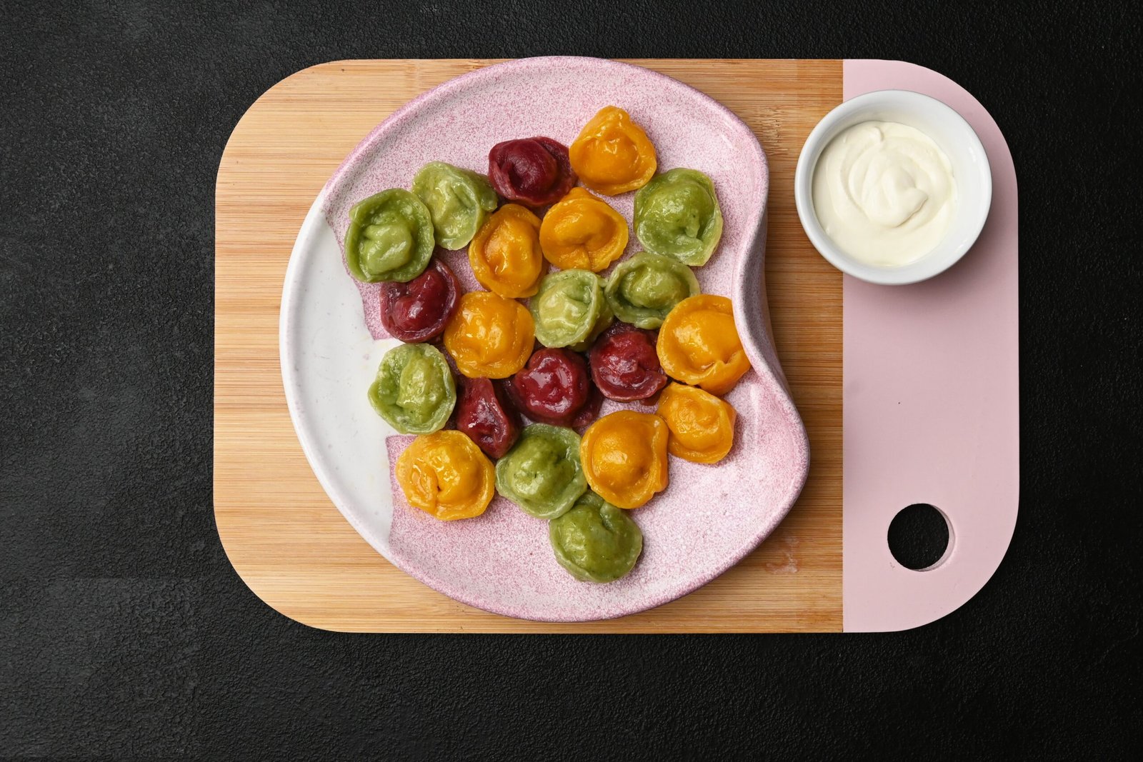 Fun, naturally coloured dumplings filled with tender chicken fillet, onion, and black pepper. The dough is coloured using natural vegetable juices (beetroot, carrot, spinach).