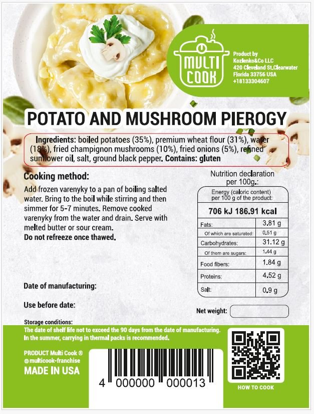 A classic savory combination. Our varenyky are filled with fluffy boiled potatoes and flavorful fried champignons, perfect for any meal.
