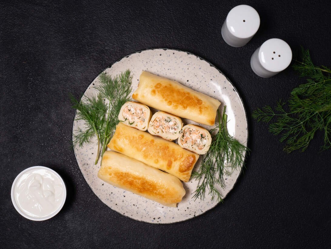 Elegant crepes filled with marinated salmon fillet and creamy cottage cheese, enhanced with fresh herbs. An excellent gourmet option for a quick lunch or appetizer.